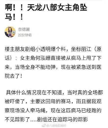 网曝新版《天龙八部》女主角在丽江拍戏坠马